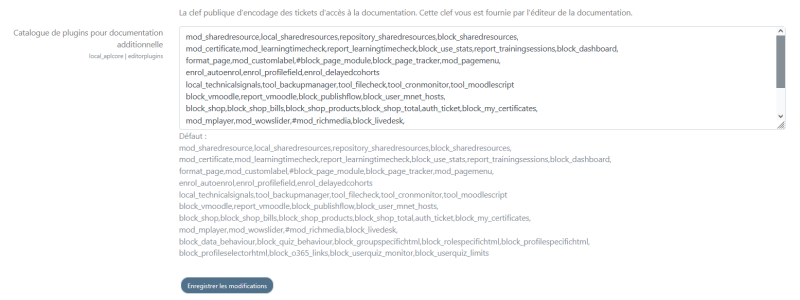 La liste de plugin bénéficiant d'une documentation étendue peut être augmentée au rythme des publications nouvelles. Ce réglage permet d'ajouter des nouveaux plugins pris en charge par la documentation étendue, même après la première installation des librairies APLCore.