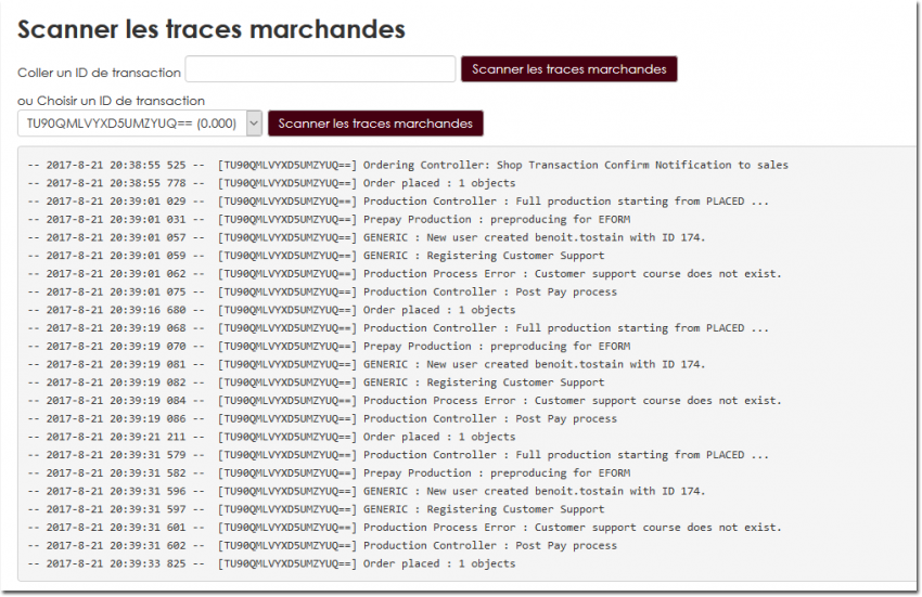 Toute visite sur la boutique, à partir de la sélection d'un produit, est associé à un Identifiant de Transaction unique. Les traces commerçantes mentionneront toujours ce code en début d'enregistrement de trace, à moins qu'une erreur intervienne avant que cet identifiant de transaction n'ait pu être récupéré ou validé.