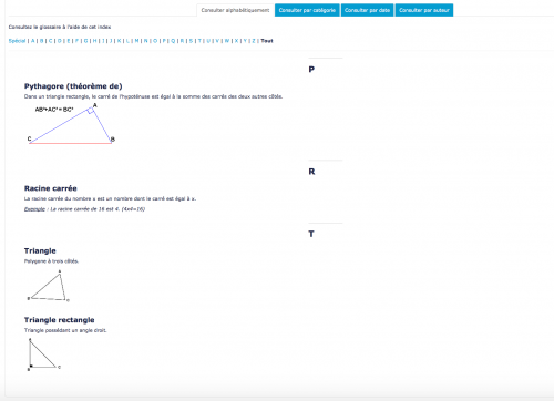 Ex: glossaire contenant des définitions pour comprendre le théorème de Pythagore