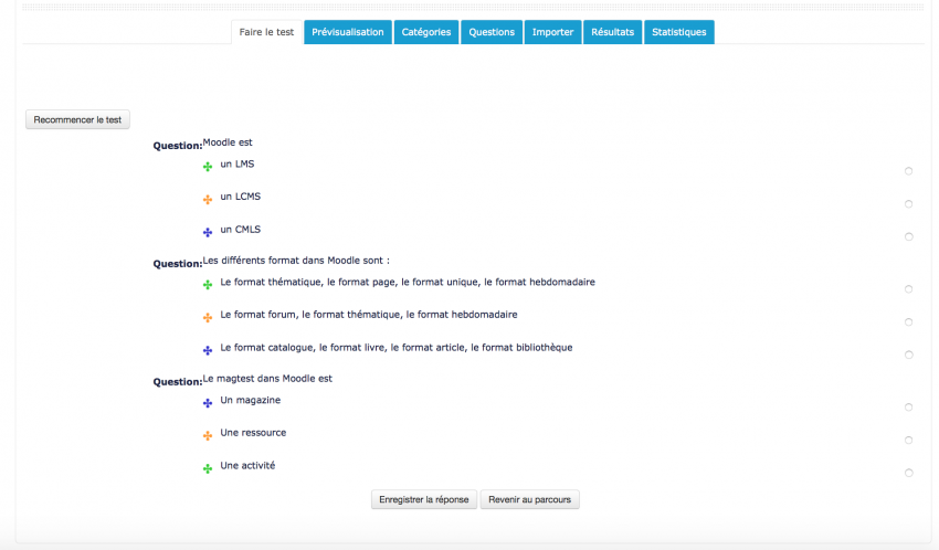Le test peut être joué une fois ou plusieurs fois selon la configuration. Il est également possible de pondérer chacune des réponses (non affiché à l'étudiant), ayant comme effet de contribuer plus ou moins au score de sa catégorie.