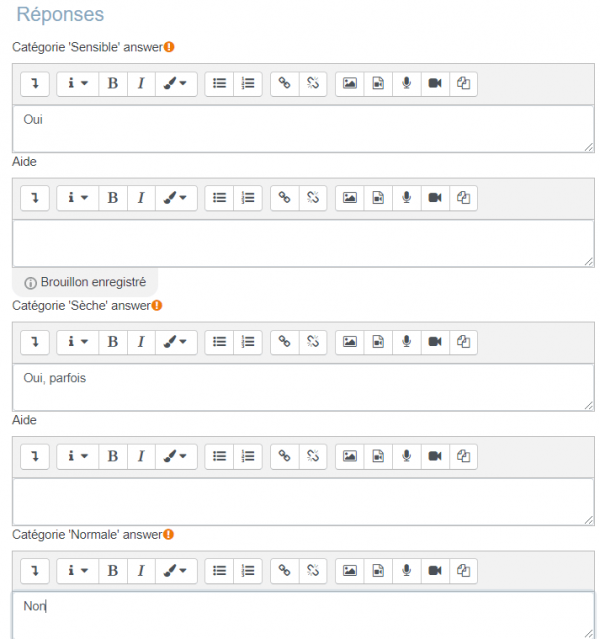 Dans l'extrait de copie écran ci-dessous, vous pouvez voir un exemple de réponse proposé pour chaque catégorie proposée (Ici il s'agit de déterminer un type de peau). Il est également possible de proposer une aide à la réponse.