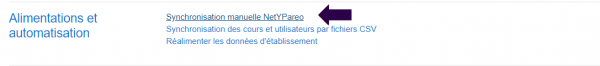 - Accédez au menu de lancement de la synchro manuelle ; Chemin : Administration du site / alimentation et automatisation / Synchronisation manuelle NetYParéo™.
