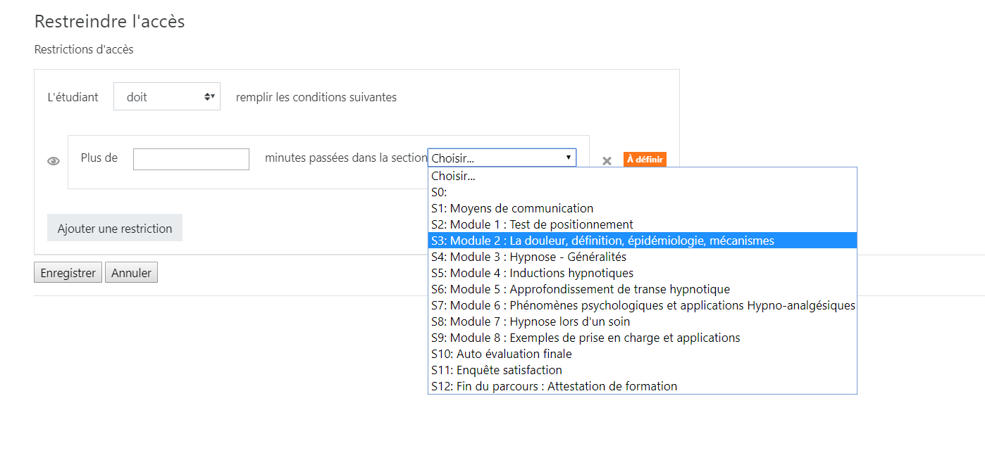 - Accédez à la section “Restreindre l'accès” et choisissez “Temps passé (section)”