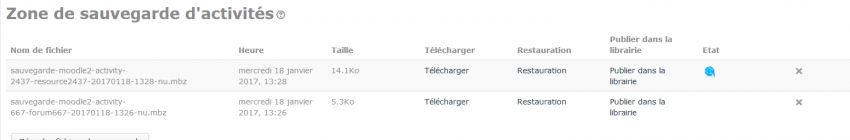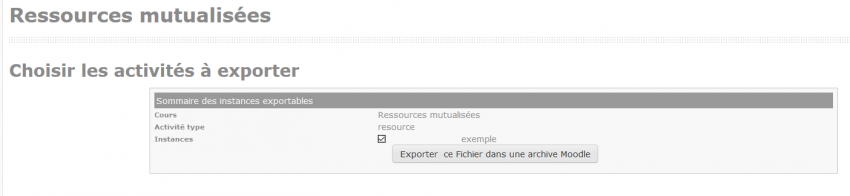 Le bloc “Exporteur d'activités” permet de créer une archive Moodle (MBZ) de n'importe quelle activité ou ressource sur le dispositif afin d'en faire une sauvegarde, et permet aussi de l'adresser en ressource mutualisée. Il peut donc être un complément précieux de l'activité Ressources mutualisées sur un cours.