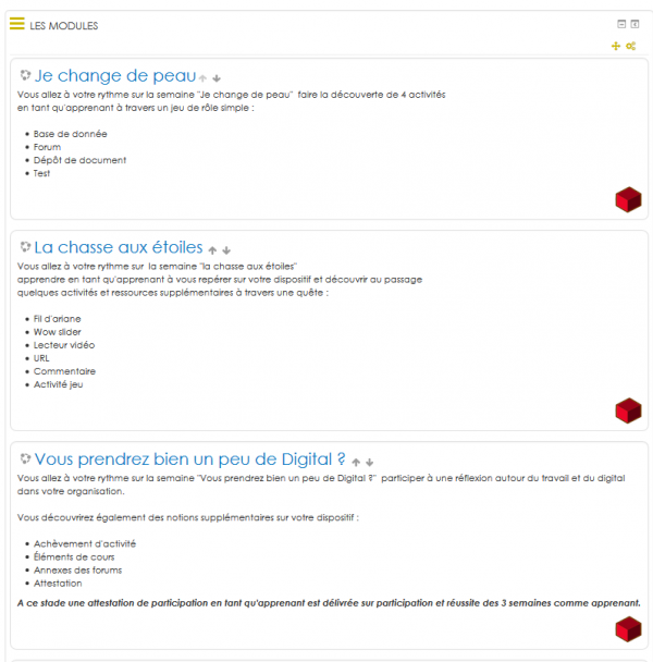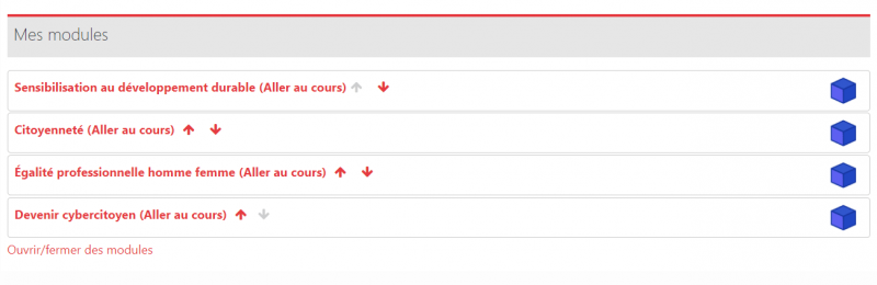 - Vert : Module achevé (marquage de l'achèvement de cours)