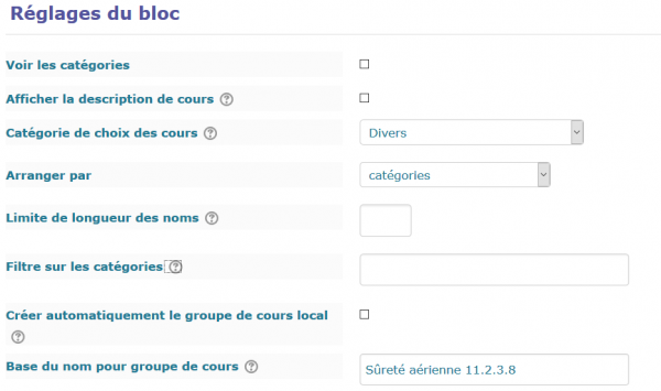 - Arranger par : Au choix, par catégorie (Moodle) ou par ordre du plan de formation (Choix des cours pour le bloc) . Ce second choix permet de réordonner les cours visibles dans le bloc dans l'ordre de son choix.