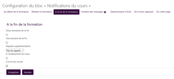 - Pour gérer le bloc en administration centrale, et décider ce qui est activé par defaut : Admin du site/plugin/blocs/notifications de cours