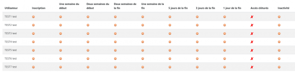 - les notifications activées avec une croix quand non émises, une coche verte quand émises.