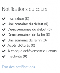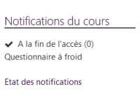 - Notifications du cours : Le bloc rend compte des signaux qui sont activés pour le cours : Dans l'exemple ci -dessous, les notifications interviendront sur fin d'inscription de l'usager (date de fin d'inscription) ou fin du cours (avec une date de fin de cours). Le chiffre entre parenthèse indique le nombre d'usagers concernés qui ont reçu le message.