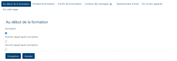 Nota : Ce bloc peut être également ajouté au tableau de bord général de l'utilisateur, qui doit alors avoir une capacité adéquate de gestion dans au moins un des cours ou dans un contexte système pour pouvoir l'utiliser. Le bloc donne accès au backoffice de gestion des notifications qui peut concerner plusieurs cours même s'ils n'ont pas d'instance de ce bloc dans leur interface.