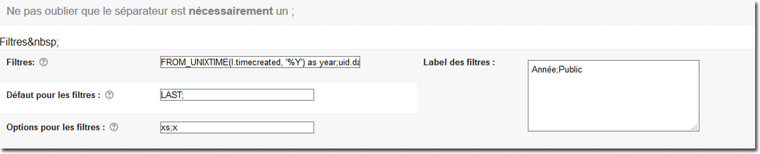 Ce champ doit être renseigné avec une liste de définitions de champs de la requête de départ. Ce champ accepte une liste à points-virgules pour définir successivement plusieurs filtres à présenter dans l'interface.