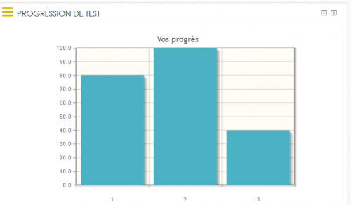 Le bloc Progression de test permet une représentation sous forme d'histogramme des résultats aux différentes tentatives d'un test pour vos apprenants. Le rendu visuel lui permet donc de mesurer ses progrès.