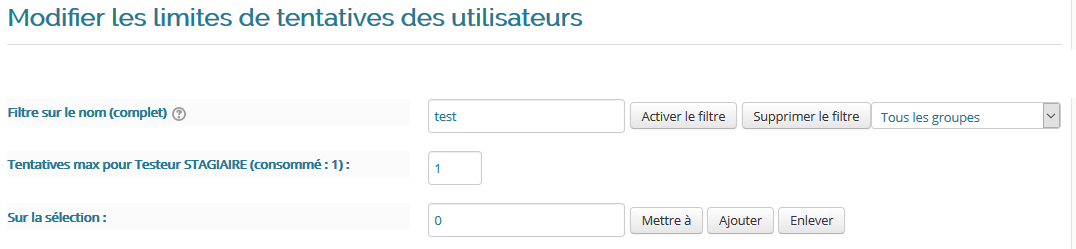 - Filtrer sur le nom : permet de saisir le nom de l'étudiant concerné par la limitation des tentatives