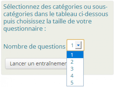 Suivant l'exemple fourni, si le nombre de question existant dans la banque pour une catégorie est inférieur à 10, le choix de révision proposé sera de 1 en 1, sinon il sera proposé de 10 en 10 questions jusqu'à la valeur maximum de questions que la sélection peut fournir.