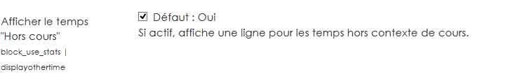 block_use_stats | displayothertime Décocher la case pour masquer sur l'interface du bloc, les temps passés en dehors du cours (dans les autres espaces sur la plateforme)