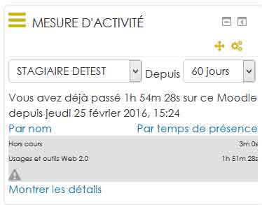 block_use_stats | displayactivitytimeonly On affiche dans le bloc soit le temps passé dans les activités, soit le temps passé dans le cours (Comme par exemple sur son espace de fichiers personnel, dans les forums, etc).