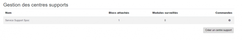 • Information : Liste des centres supports créés. Un seul dans cet exemple qui surveille les forums de 5 cours qui constituent un parcours SPOC. (MOOC de taille réduite avec population ciblée). la roue crantée permet aux ayants-droit de modifier les paramètres de ce centre support spécifique.