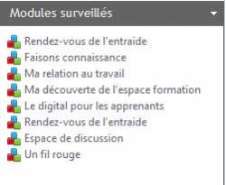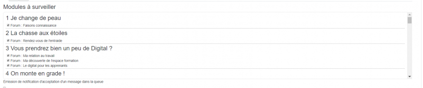 • Modules à surveiller : Cocher la liste de tous les forums à surveiller issus de tous les cours “capturés” dans l'interface du livedesk et listés. Dans l'exemple ci-dessous 7 forums issus de 4 cours différents qui constituent un parcours pédagogique cohérent.
