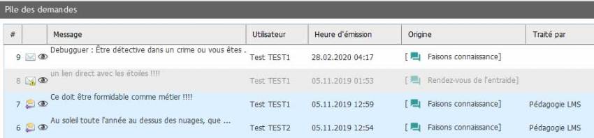 • Liste des messages issus de tous les modules forums surveillés. Cliquez sur un message pour le traiter en y répondant, comme vous le feriez en allant dans le forum concerné du cours concerné, et enregistrez votre réponse. Le message est désormais tagué comme “traité” dans l'interface. –> Vous pouvez aussi faire un clic droit sur l'icône du message pour obtenir le menu contextuel.