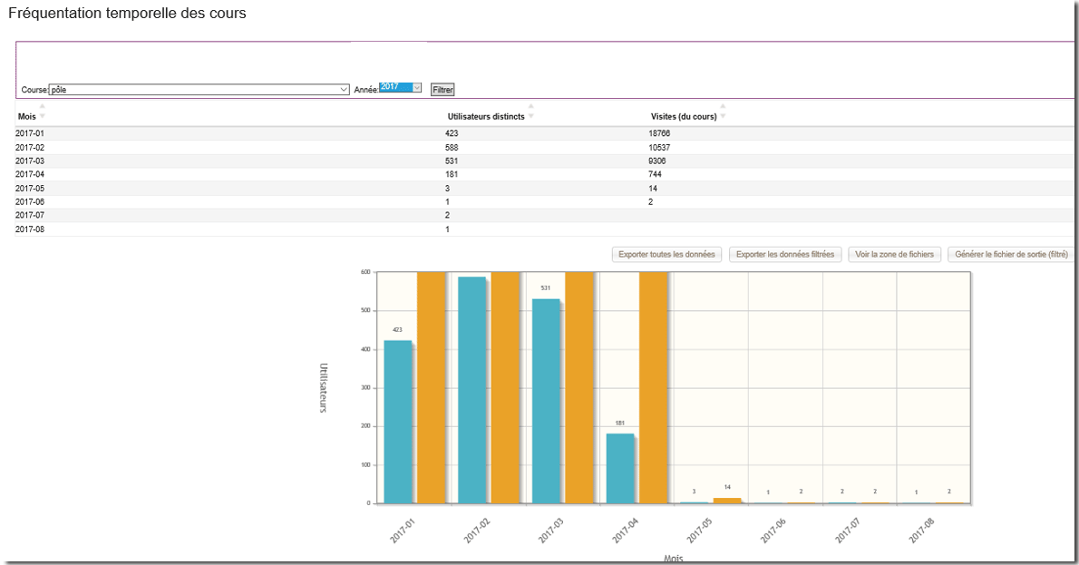 Rendu avec filtres par cours et par an, et données de sortie par mois, utilisateurs disctincts et visites du cours