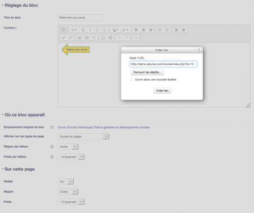 - Titre du bloc : Il s'agit du titre qui apparaitra sur la page du cours.