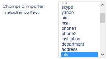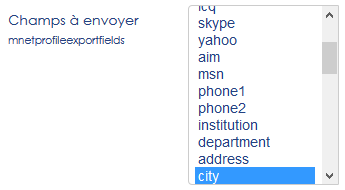 Défaut : city, country, lang, timezone, picture, description, mailformat, maildigest, maildisplay Nota : Les champs suivants sont toujours envoyés et ne sont pas optionnels : username, email, firstname, lastname, auth, wwwroot, session.gc_lifetime, _mnet_userpicture_timemodified, _mnet_userpicture_mimetype