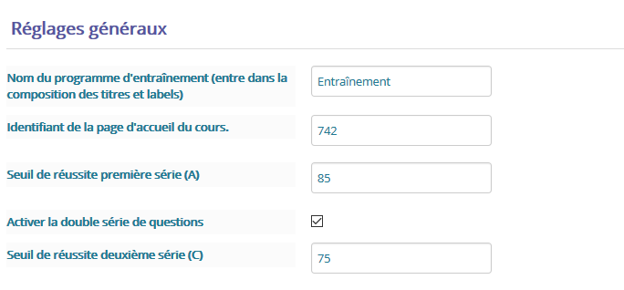 C'est dans la section ou onglet réglages généraux que vous indiquerez les deux seuils choisis, dans cet exemple 75% pour la première catégorie de tests, 85% pour la seconde. Si vous n' utilisez qu'un seuil seuil, décochez la case “Activer la double série de question”