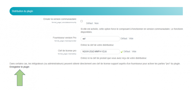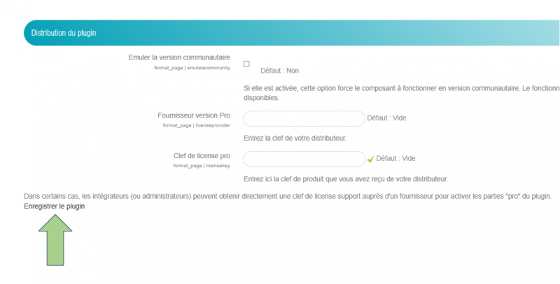 A/ Une fois le plugin installé, en fin de section “Distribution du plugin”, cliquez directement sur le lien Enregistrer le plugin