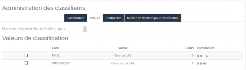 Pour chaque classifieur créé, affectez ensuite la liste des valeurs possibles, via l'onglet Valeurs, en choisissant dans la liste déroulante le classifieur concerné par les valeurs à créer. Exemple pour le classifieur Statut