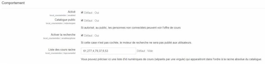 - Liste des cours racine : Vous pouvez préciser ici une liste d'id numériques de cours séparés par une virgule pour les cours “à la une” , c'est à dire présentés à la racine absolue du catalogue.