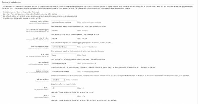 - L'indexation des cours et formations s'appuie sur la gestion de métadonnées additionnelles de classification. Ce modèle peut être fourni par plusieurs composants potentiels de Moodle, voire des tables extérieures à Moodle. L'indexation de cours nécessite 4 tables pour faire fonctionner le cataloque, lesquelles peuvent être décrites par ce schéma. Le raccordement par défaut utilise les tables de métadonnées du plugin “Elément de cours”. Ces métadonnées pourraient résider dans tout modèle qui respecte les définitions suivantes :