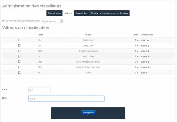 Exemple de valeurs pour le classifieur “Origine du cours”