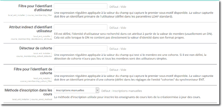 Pour les attributions de rôle sur la base de l'attribut multivalué “member” (ou autre attribut d'appartenance tel que défini par le paramètrage de l'authentification LDAP), le synchroniseur est capable de discerner des identifiants portant sur des utilisateurs uniques ou des cohortes. Le détecteur de cohort est une expression régulière caractéristique détectant le type “cohorte” dans l'enregistrement de membre.