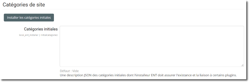Ce réglage permet de définir un ensemble de catégories qui doivent être garanties dans Moodle au démarrage de la plate-forme (et en permanence), pour servir un modèle pédagogique ou le fonctionnement de certains plugins.