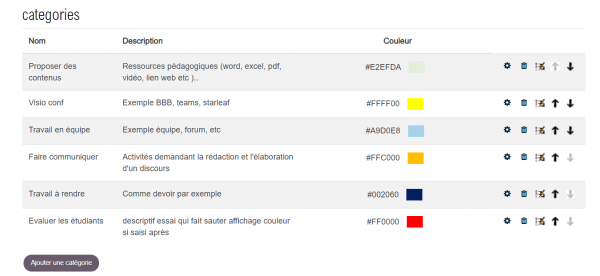 Par ailleurs, l'administrateur peut créer des catégories d'outils et leur affecter un code couleur, afin d'appuyer les enseignants dans ses repères fonctionnels.