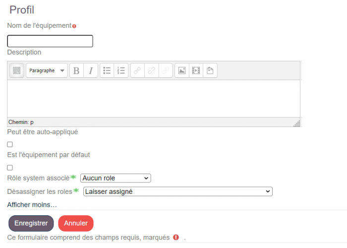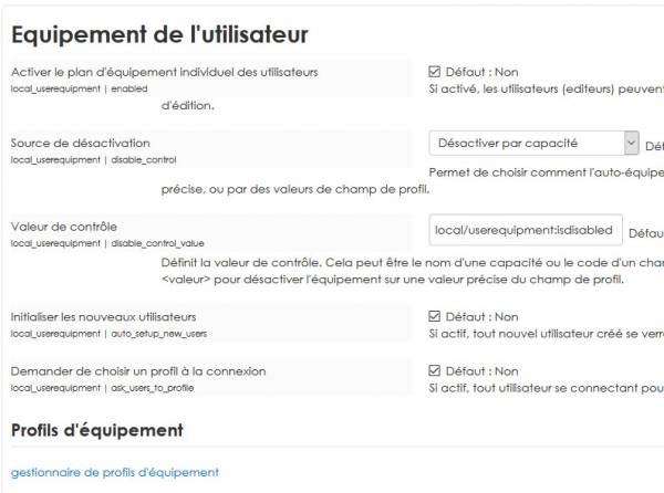 - Chemin : Menu Administration du site/plugins/PLugins locaux/Équipement de l' utilisateur