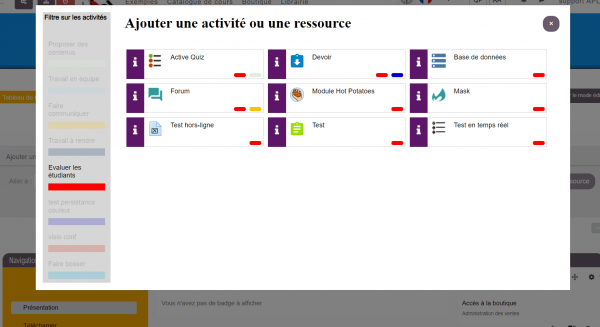 Pour un repérage fonctionnel des enseignants, vous pouvez créer des catégories fonctionnelles d'outil ,et leur affecter des plugins. En résultante le sélecteur d'activité standard de Moodle sera remplacé par un sélecteur présentant les divers plugins possible, “rangés” et filtrables par familles fonctionnelles. Pour un enseignant débutant sous Moodle, c'est donc un élément de guidance extrémement précieux pour savoir à quoi correspond sur le plan pédagogique et fonctionnel, chaque activité ou ressource possible.