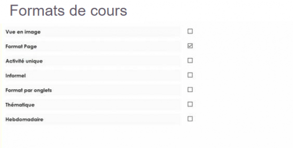 - Formats de cours : Seuls les formats de cours visibles seront accessibles à l'utilisateur.