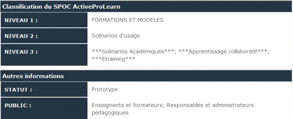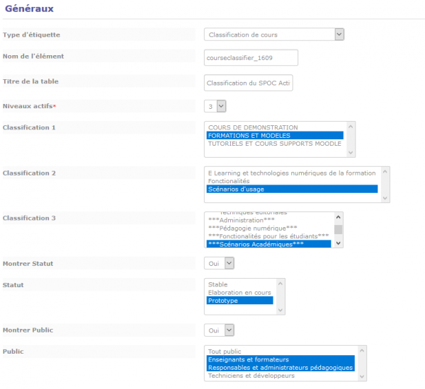 Rappel : Cet élément de cours s'appui sur des “taxonomies” de classification. Ces définitions sont rassemblées dans les réglages centraux du plugin des éléments de cours.