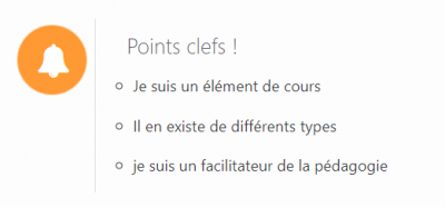 L'élément “Points clés” permet de souligner en fin de séquence ou de page de cours les points clefs qui doivent être appris et mémorisés. Ce sont en général des concepts “repère” dans la connaissance, des “balises” de savoir qui permettent par déduction ou par procédés mnémotechniques ou praxéotomiques de retrouver une connaissance plus fine.