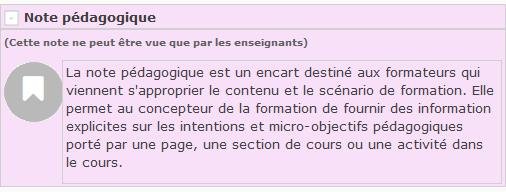 La Note pédagogique s'adresse à des acteurs spécifique de la chaîne pédagogique. Elles ont pour but de permettre l'édition d'un “meta-contenu” à destination des pédagogues (resp. des auteurs).