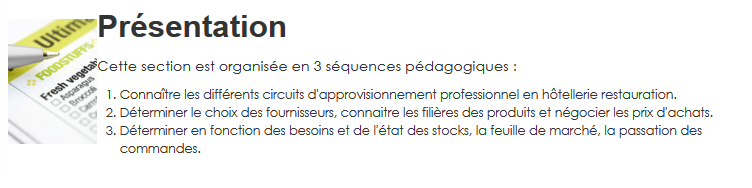 L'en-tête de section est donc utilisée pour signaler un chapitre. Cet élément de cours peut aller de pair avec le titre de séquence afin de constituer un ensemble de chapitres et sous chapitres.