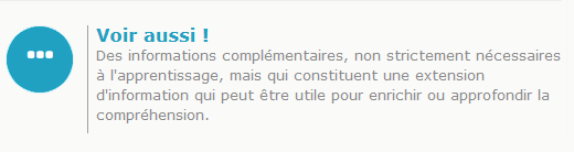 L'élément pédagogique “Voir aussi” permet d'apporter à l'apprenant des ressources supplémentaires à celles qui sont déjà présentes dans le cours (documents, liens …etc.).