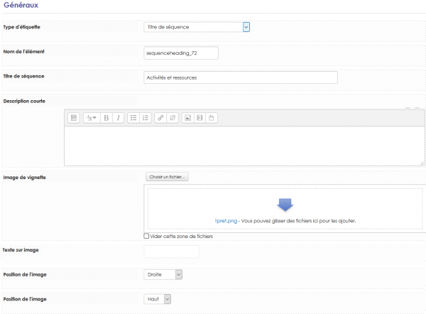 - Image de vignette : Image ou vignette, taille 100 X 100 pixels maximum si pas de descriptif pour un affichage correct. L'image peut être téléchargée par glisser/déposer ou bien en passant par l'option “Parcourir…”.