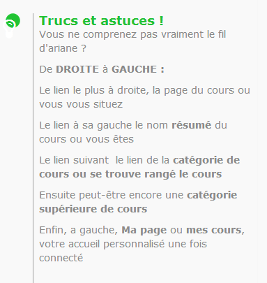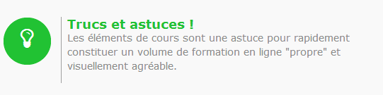 L'élément de cours “Trucs et Astuces” permet de marquer visuellement des conseils pratiques (aide praxéologique) pour faciliter la réalisation de certaines tâches demandées. Moins formel qu'une définition ou une instruction, il peut concerner aussi bien un élément sur l'interface du cours, comme dans l'exemple ci dessous, qu'un élément lié au corpus du cours.
