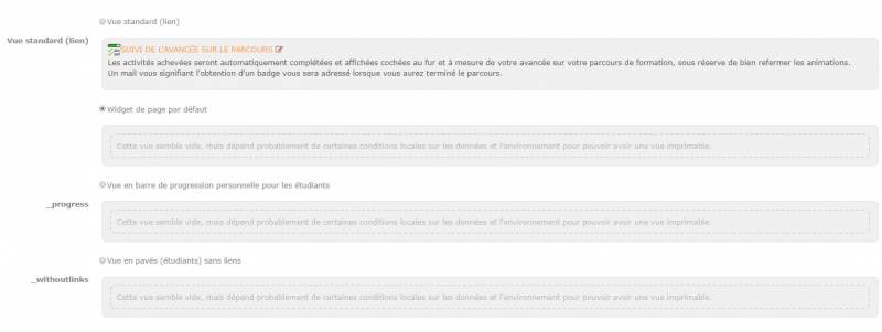 - Vue widget de page par defaut: vue “en pavés” des activités et ressources tracées par le LTC avec lien automatique vers chaque activité tracée. ((tel que sur les illustrations ci dessus)