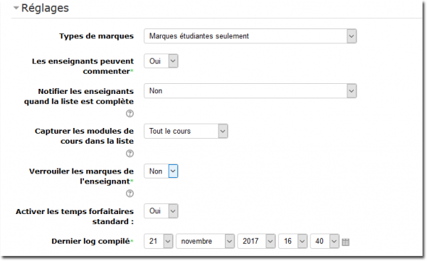 - Activer les temps forfaitaires standards : Non : réagis comme une check-list de complétude sans prise en compte des temps affectés (utile pour prise en compte d'activités non Moodle par exemple)