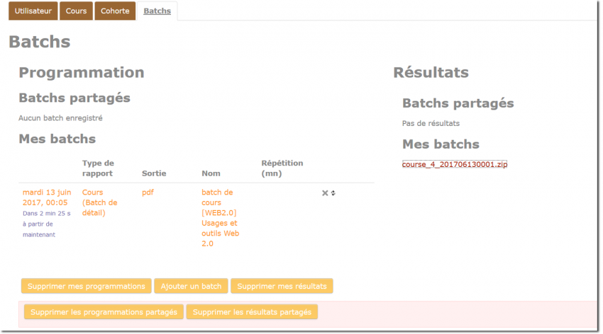- Partager le batch : Case à cocher . En activant le partage, vous autorisez d'autres utilisateurs ayant accès au service de batchs à voir cette programmation et à récupérer ses résultats.
