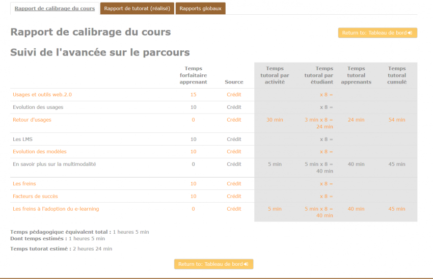 - Colonne 3 Temps tutoral par activité : Temps global de tutorat sur l'activité (exemple animation globale d'un forum)