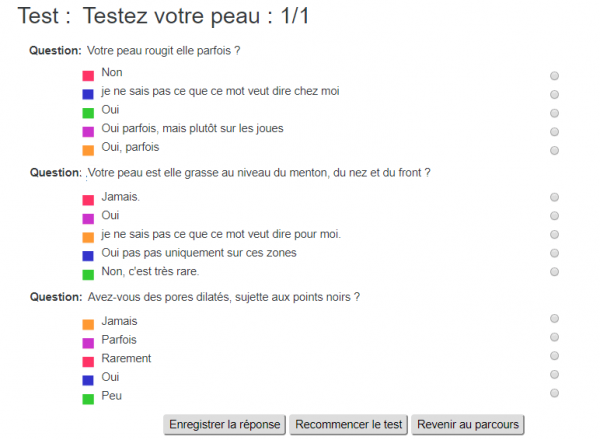 L'étudiant n'a qu'à répondre aux question, ce qui lui permettra d'obtenir un score pour chacune des catégories de classement. Les informations de sa “catégorie dominante” lui sont signalées à la fin du test, par un affichage mis en évidence.